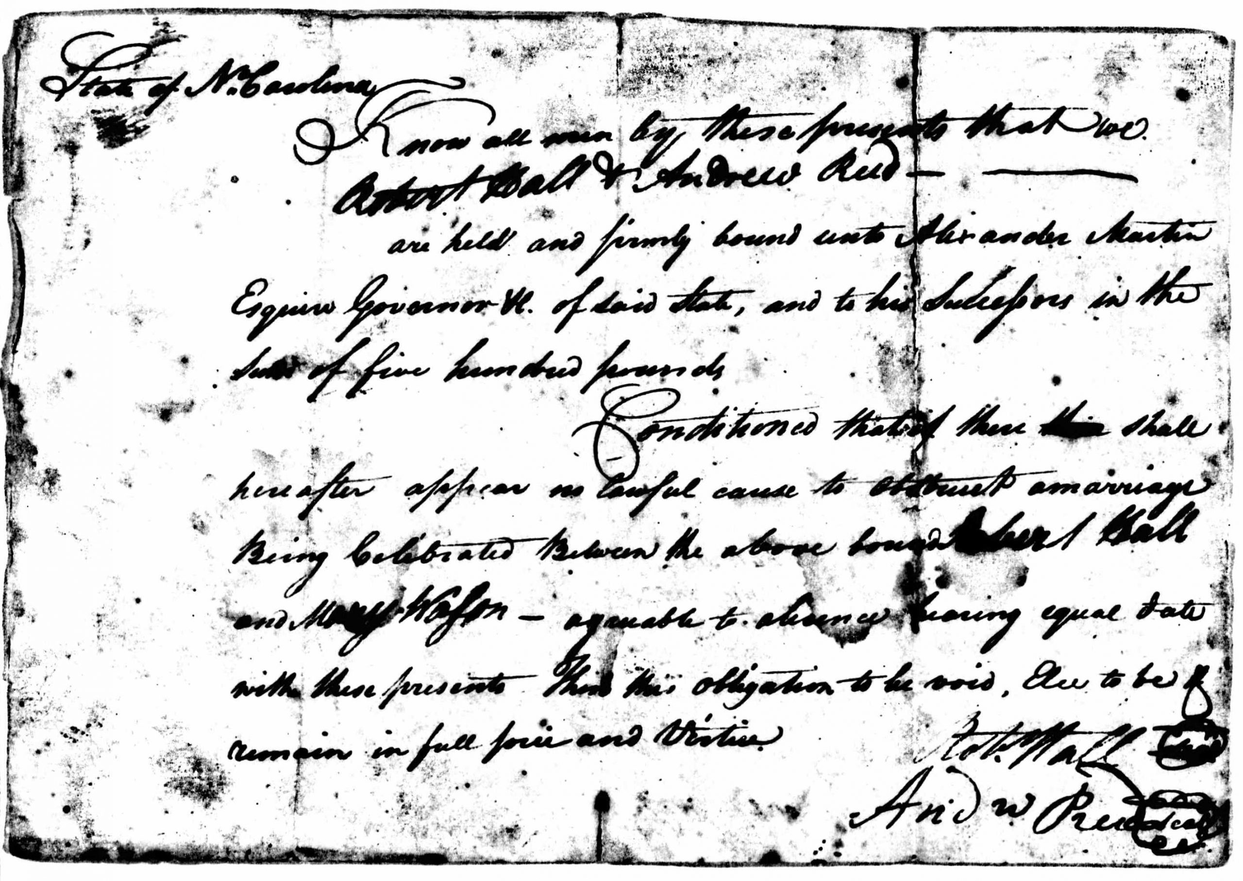 3/ Bond is from Rowan county. As the Halls were from Iredell county, and Iredell was not formed until 1788, it is likely during Gov. Martin’s first term.